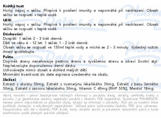 Horký nápoj v sáčku. Přispívá k posílení imunity a napomáhá při nachlazení. Obsah sáčku se rozpustí v teplé vodě.