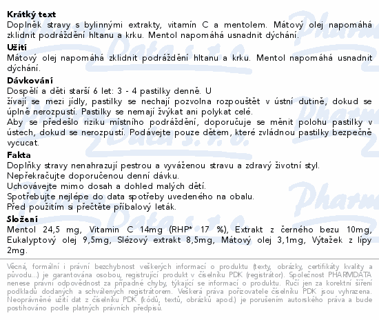 Doplněk stravy s bylinnými extrakty, vitamín C a mentolem. Mátový olej napomáhá zklidnit podráždění hltanu a krku. Mentol napomáhá usnadnit dýchání.