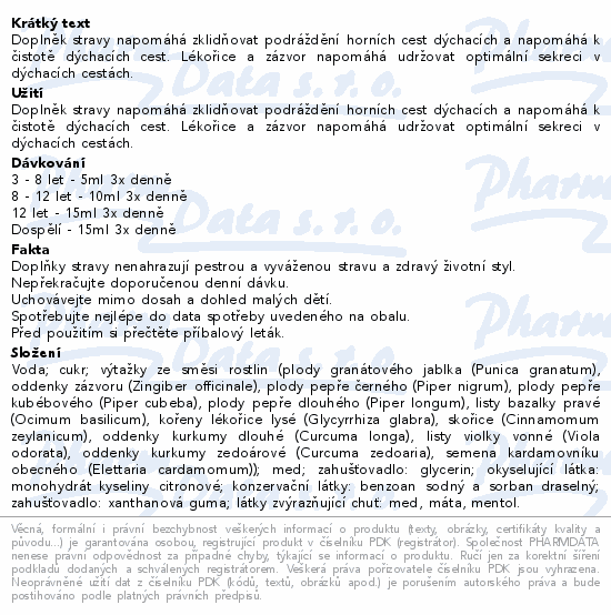 Doplněk stravy napomáhá zklidňovat podráždění horních cest dýchacích a napomáhá k čistotě dýchacích cest. Lékořice a zázvor napomáhá udržovat optimální sekreci v dýchacích cestách.