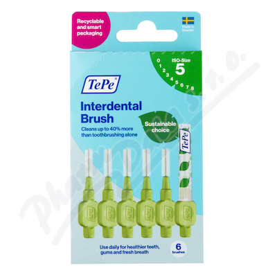 TePe Original mezizubní kartáčky 0, 8 mm, zelené 6 ks. Drátek je potažený plastem pro maximální ochranu dásní a citlivých zubních krčků. Vysoce odolné vůči zlomení. Plochá rukojeť pro pohodlné a přesné čištění. Baleno v papírové uzavíratelné krabičce.