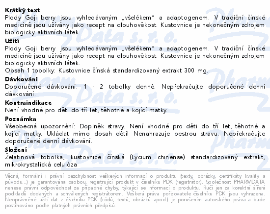 Plody Goji berry jsou vyhledávaným "všelékem" a adaptogenem. V tradiční čínské medicíně jsou užívány jako recept na dlouhověkost. Kustovnice je nekonečným zdrojem biologicky aktivních látek.