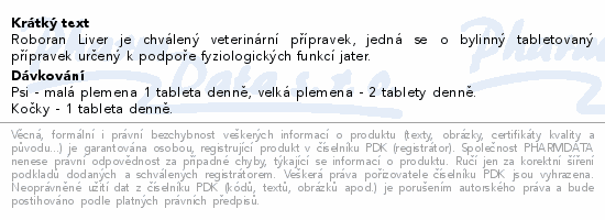 Roboran Liver je chválený veterinární přípravek, jedná se o bylinný tabletovaný přípravek určený k podpoře fyziologických funkcí jater.