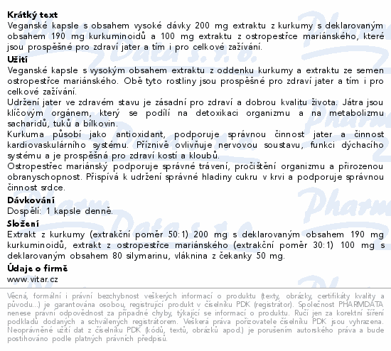 Veganské kapsle s obsahem vysoké dávky 200 mg extraktu z kurkumy s deklarovaným obsahem 190 mg kurkuminoidů a 100 mg extraktu z ostropestřce mariánského, které jsou prospěšné pro zdraví jater a tím i pro celkové zažívání.