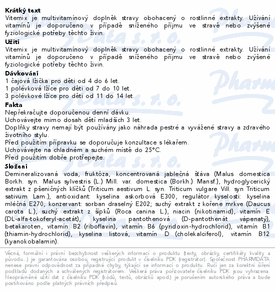 Vitemix je multivitamínový doplněk stravy obohacený o rostlinné extrakty. Užívání vitamínů je doporučeno v případě sníženého příjmu ve stravě nebo zvýšené fyziologické potřeby těchto živin.