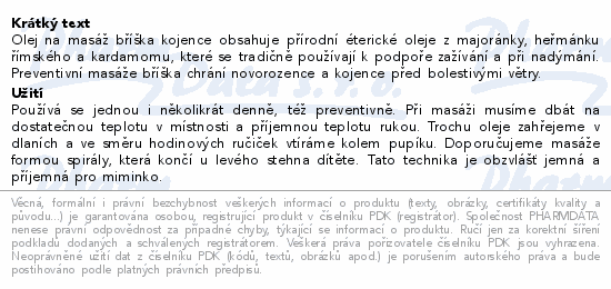 Olej na masáž bříška kojence obsahuje přírodní éterické oleje z majoránky, heřmánku římského a kardamomu, které se tradičně používají k podpoře zažívání a při nadýmání. Preventivní masáže bříška chrání novorozence a kojence před bolestivými větry.