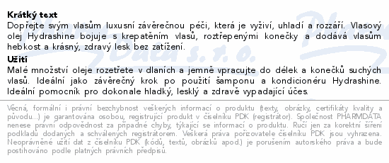 Dopřejte svým vlasům luxusní závěrečnou péči, která je vyživí, uhladí a rozzáří. Vlasový olej Hydrashine bojuje s krepatěním vlasů, roztřepenými konečky a dodává vlasům hebkost a krásný, zdravý lesk bez zatížení.