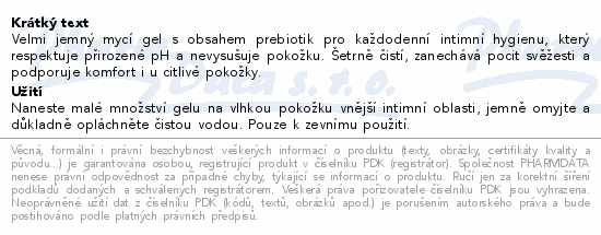 Velmi jemný mycí gel s obsahem prebiotik pro každodenní intimní hygienu, který respektuje přirozené pH a nevysušuje pokožku. Šetrně čistí, zanechává pocit svěžesti a podporuje komfort i u citlivé pokožky.