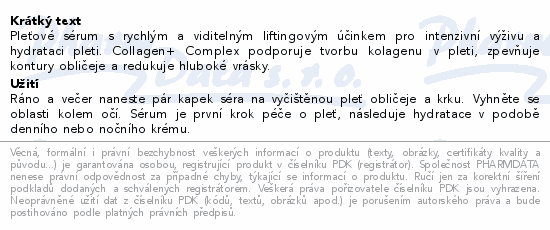 Pleťové sérum s rychlým a viditelným liftingovým účinkem pro intenzivní výživu a hydrataci pleti. Collagen+ Complex podporuje tvorbu kolagenu v pleti, zpevňuje kontury obličeje a redukuje hluboké vrásky.