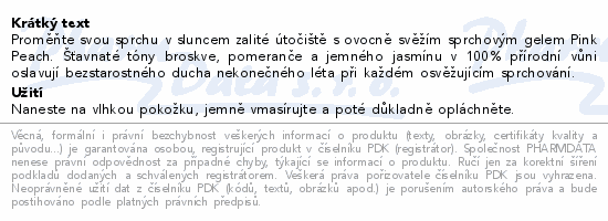Proměňte svou sprchu v sluncem zalité útočiště s ovocně svěžím sprchovým gelem Pink Peach. Šťavnaté tóny broskve, pomeranče a jemného jasmínu v 100% přírodní vůni oslavují bezstarostného ducha nekonečného léta při každém osvěžujícím sprchování.