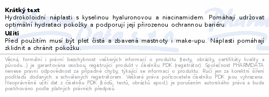 Hydrokoloidní náplasti s kyselinou hyaluronovou a niacinamidem. Pomáhají udržovat optimální hydrataci pokožky a podporují její přirozenou ochrannou bariéru.