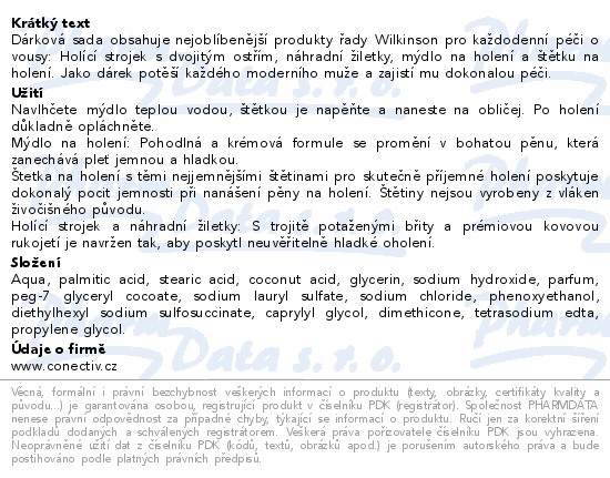 Dárková sada obsahuje nejoblíbenější produkty řady Wilkinson pro každodenní péči o vousy: Holící strojek s dvojitým ostřím, náhradní žiletky, mýdlo na holení a štětku na holení. Jako dárek potěší každého moderního muže a zajistí mu dokonalou péči.