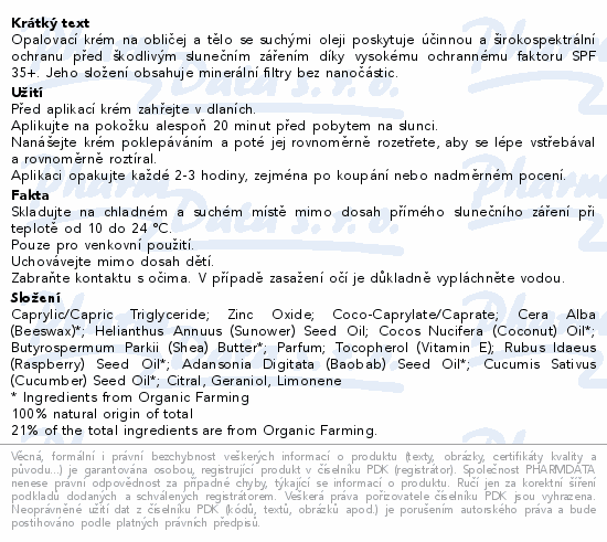 Opalovací krém na obličej a tělo se suchými oleji poskytuje účinnou a širokospektrální ochranu před škodlivým slunečním zářením díky vysokému ochrannému faktoru SPF 35+. Jeho složení obsahuje minerální filtry bez nanočástic.