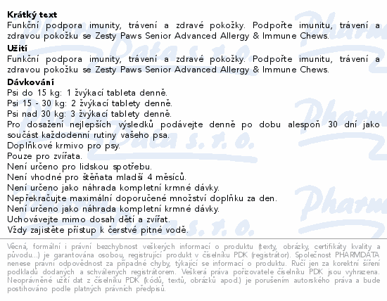 Funkční podpora imunity, trávení a zdravé pokožky. Podpořte imunitu, trávení a zdravou pokožku se Zesty Paws Senior Advanced Allergy & Immune Chews.